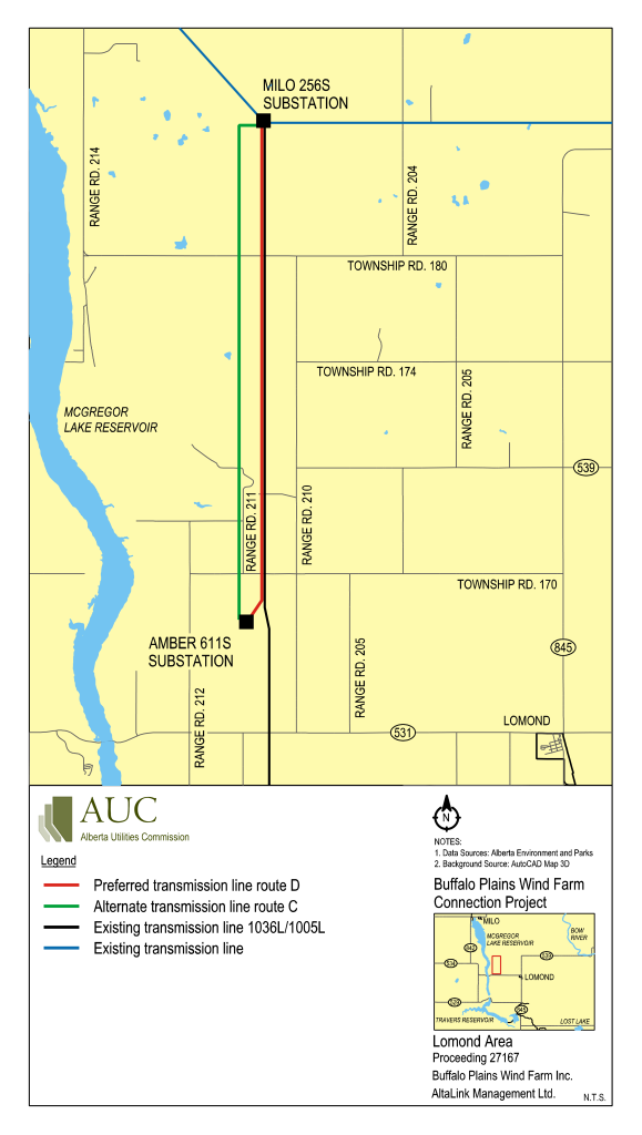The map below identifies the routes by Buffalo Plains Wind Farm Inc. which includes the preferred route that was approved in the AUC’s decision and an alternate route that was also considered in this proceeding.