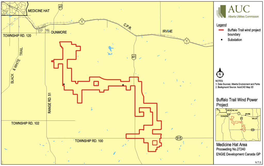 The project will consist of up to 65 wind turbines in two 200-MW phases (north and south phases). Each phase would have a separate substation, which would be designated as Buffalo Trail North Substation and Buffalo Trail South Substation. The project will be located in Cypress County and the project area and proposed substation locations are shown on the map below.