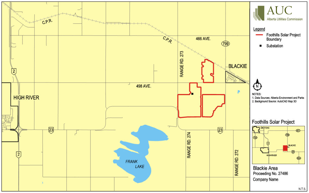 The map below identifies the applied-for area by the Foothills Solar GP Inc., which includes the project boundary and substation location which was considered in this proceeding.